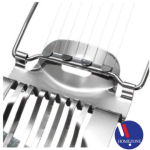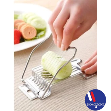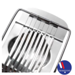 Put the egg into the hole of the slicer, with one quick push down, you will get even slices